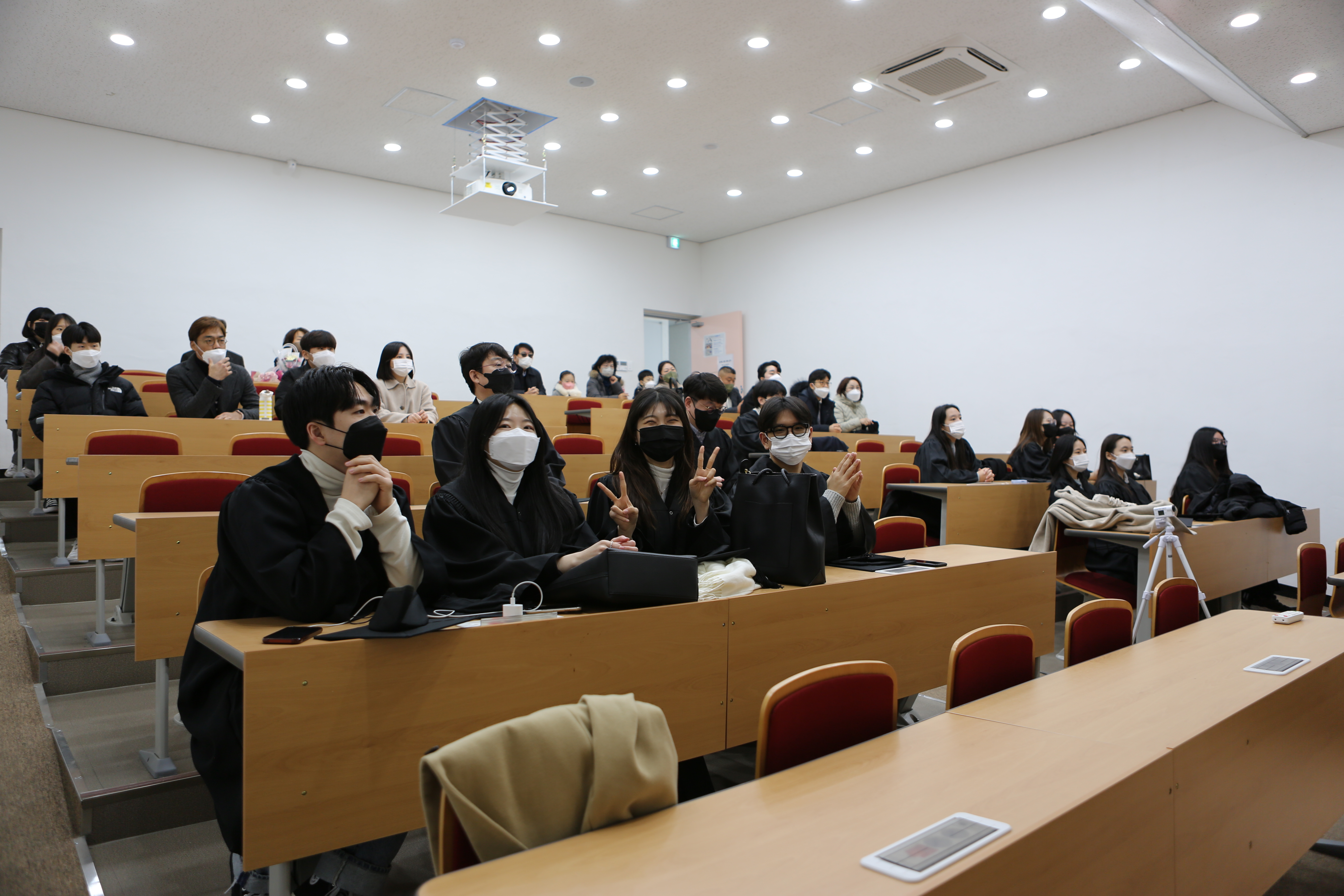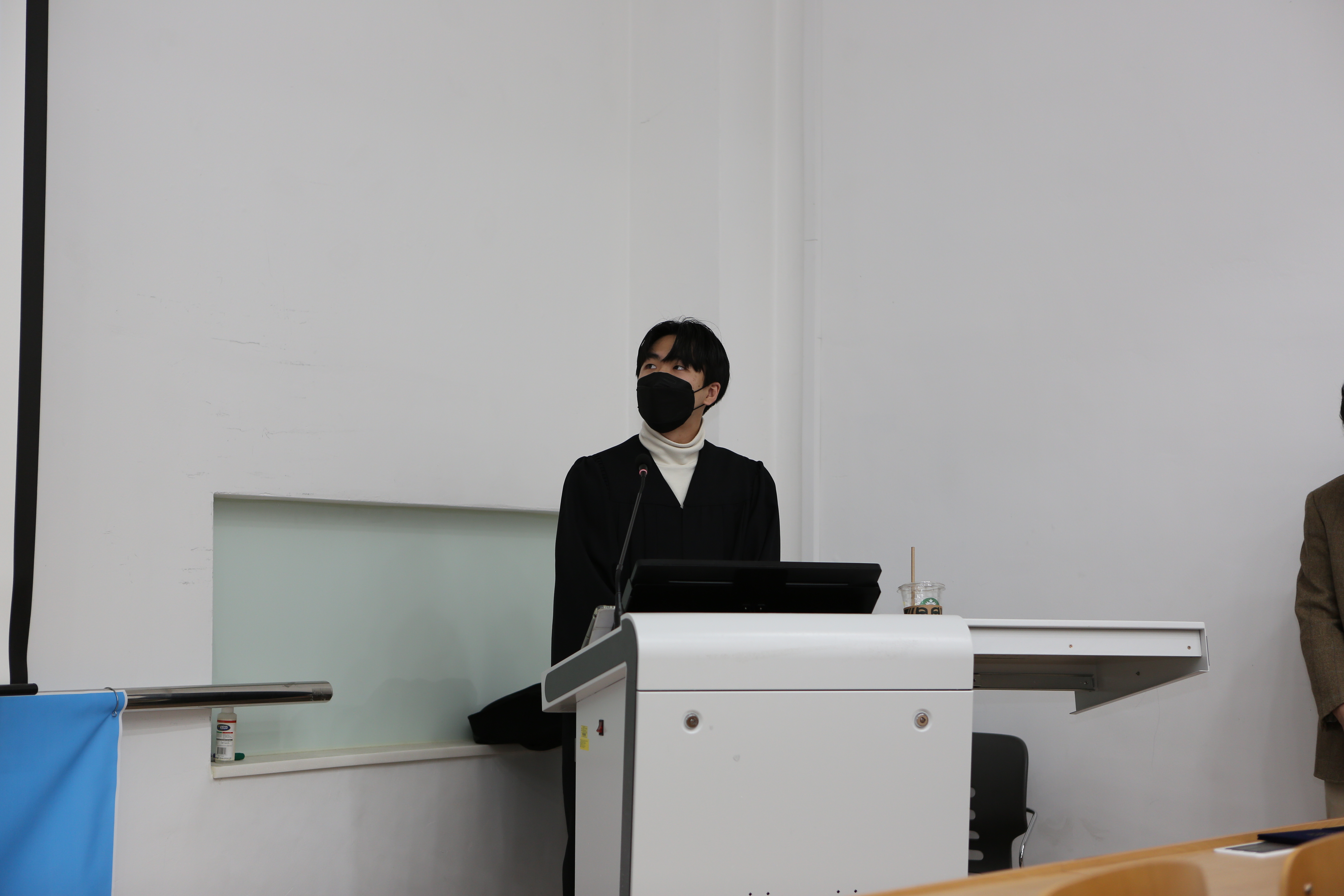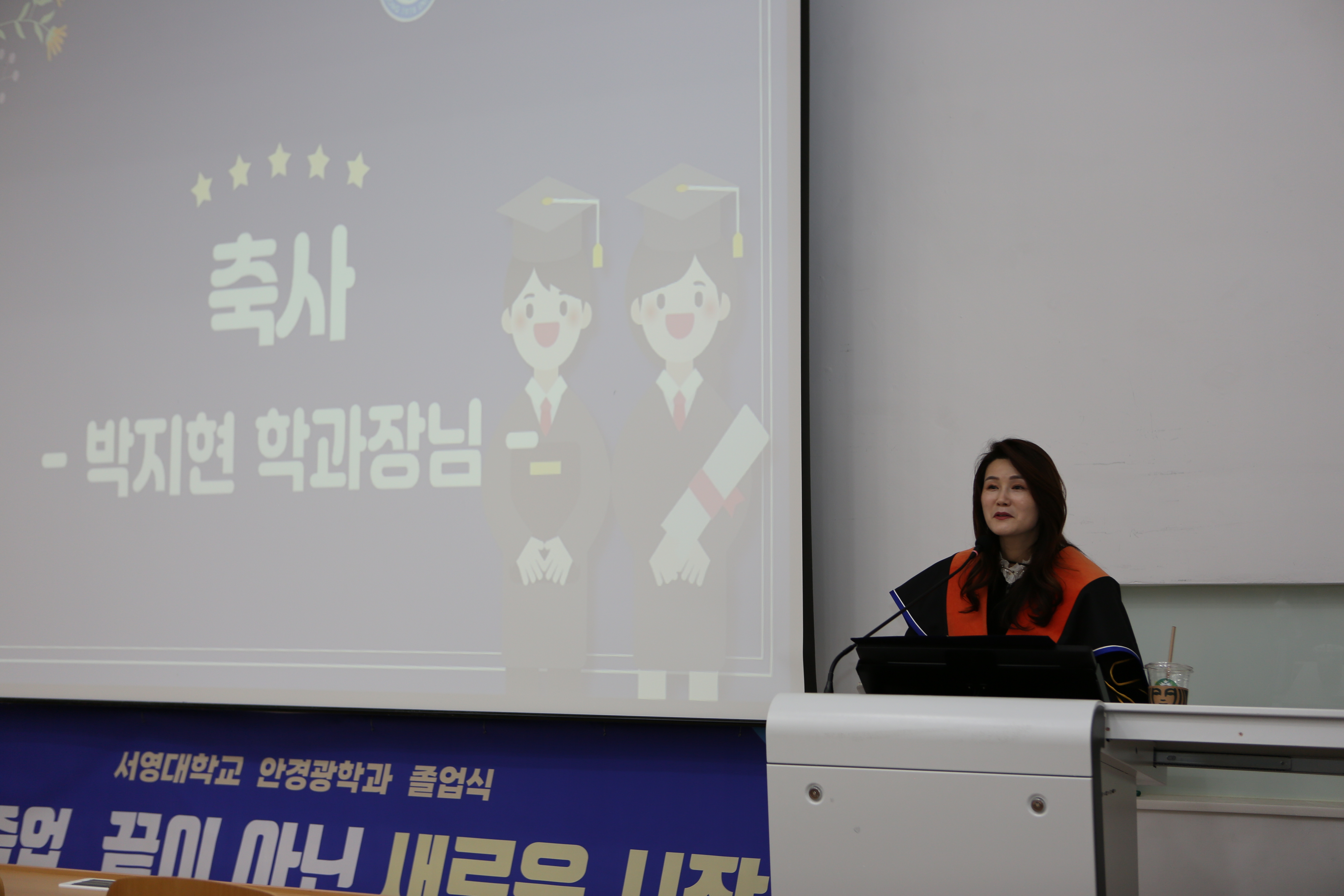 이어서 박지현 학과장님께서 축사를 통해 사회에 첫발을 내딛는 학생들을 향한 격려의 말씀을 전해주셨고, 재학생을 대표하여 부학회장이 졸업하는 선배들에게 송사를, 졸업생이 이어서 답사를 진행하며 졸업식이 마무리 되었습니다.