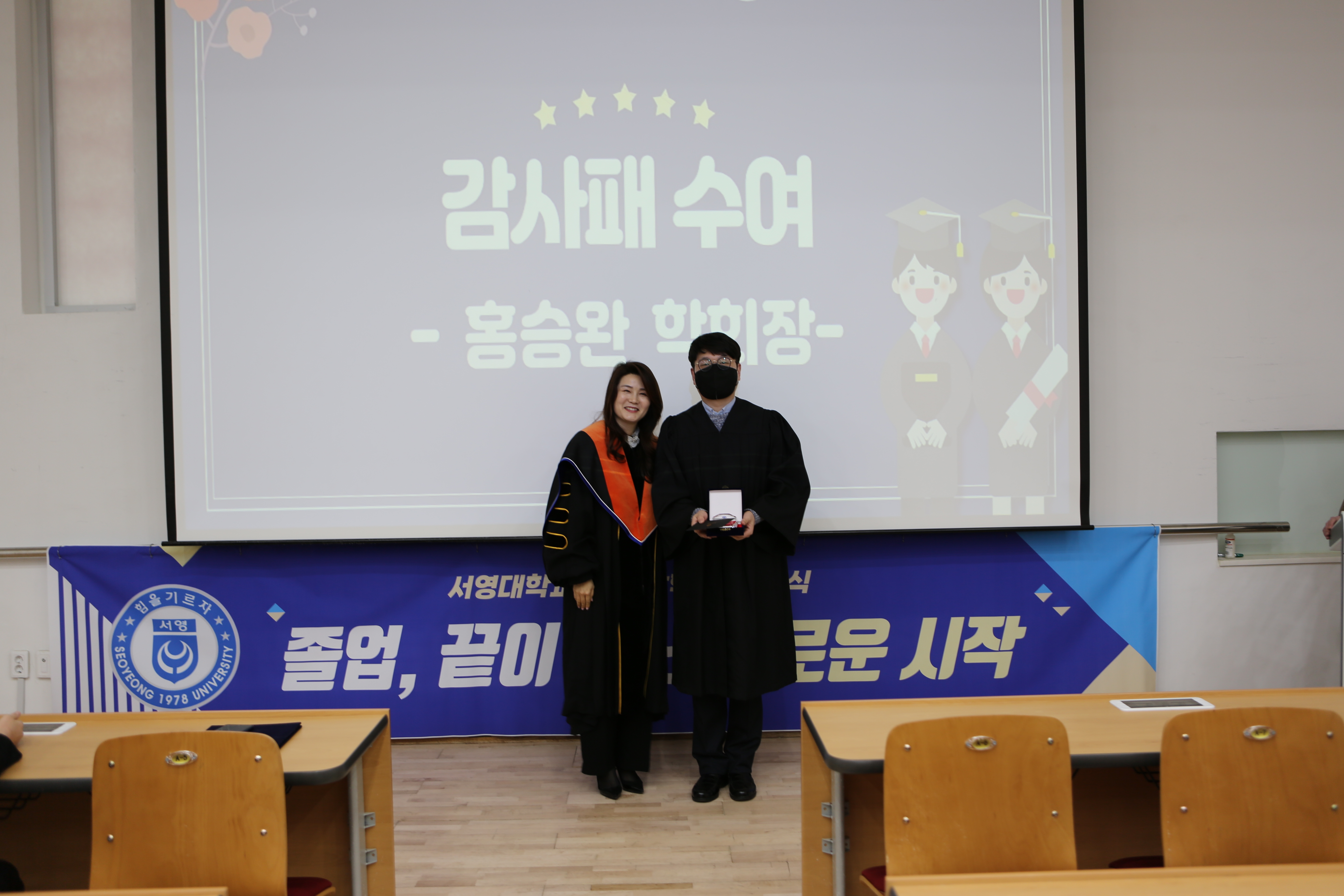 특별히 3년간 학과를 위해 애써주신 제 1대 학생회장님께도 총학생회가 학과를 대표하여 감사패를 전달하여 드렸습니다.