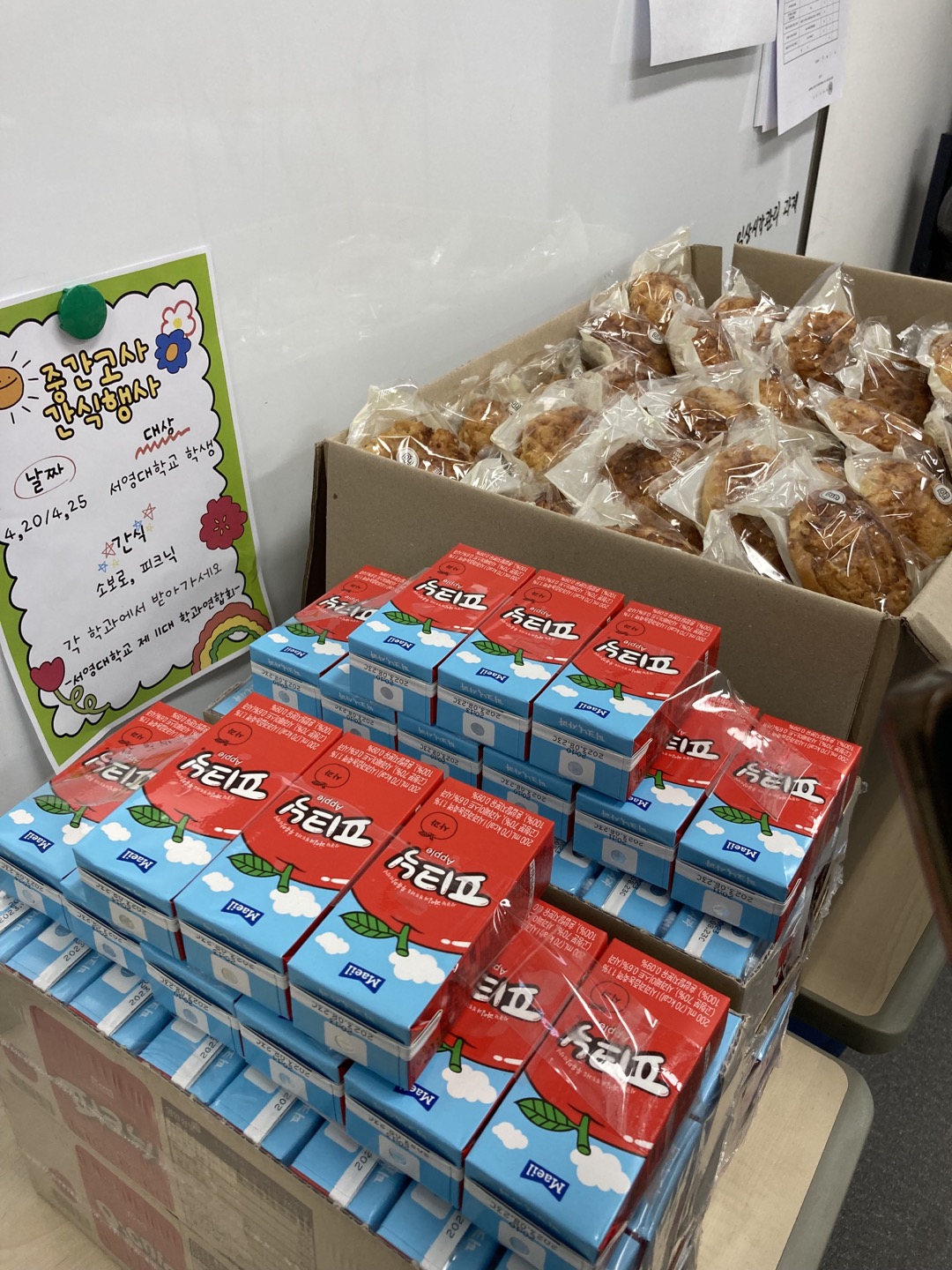 중간고사준비로 지치고 힘든 재학생들에게 열심히 준비한 만큼 최선의 결과가 있기를 응원하는 마음으로 맛있는 간식을 전달하였습니다.