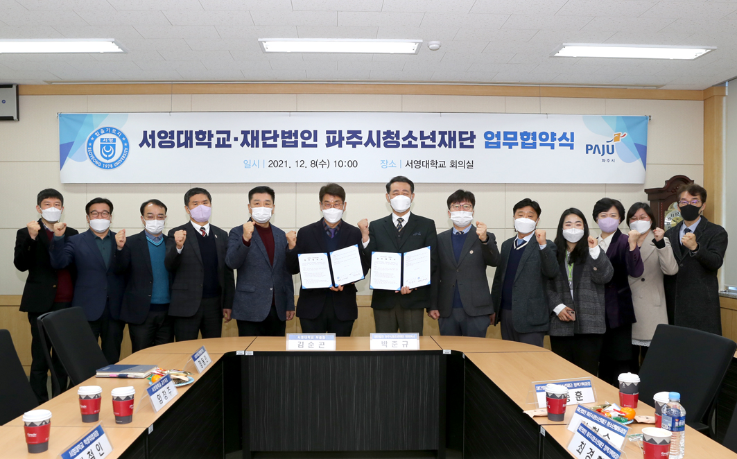 O. 8일 , 서영대학교 파서영대학교 ( 총장 김정수)는 파주시청소년재단 (대표이사 박준규)와 김순곤 서영대학교 부총장, 장동민 입학홍보처장, 임창주 교무처장, 장철인 학생취업처장, 박준규 파주시청소년재단 대표이사, 박종훈 정책기획과장, 김형수 청소년활동과장 등 20명의 관계자가 참석하여 양기관 간 협력을 통해 파주시 청소년의 공공복리 증진을 위한 업무협약 체결을 진행 하였다.
