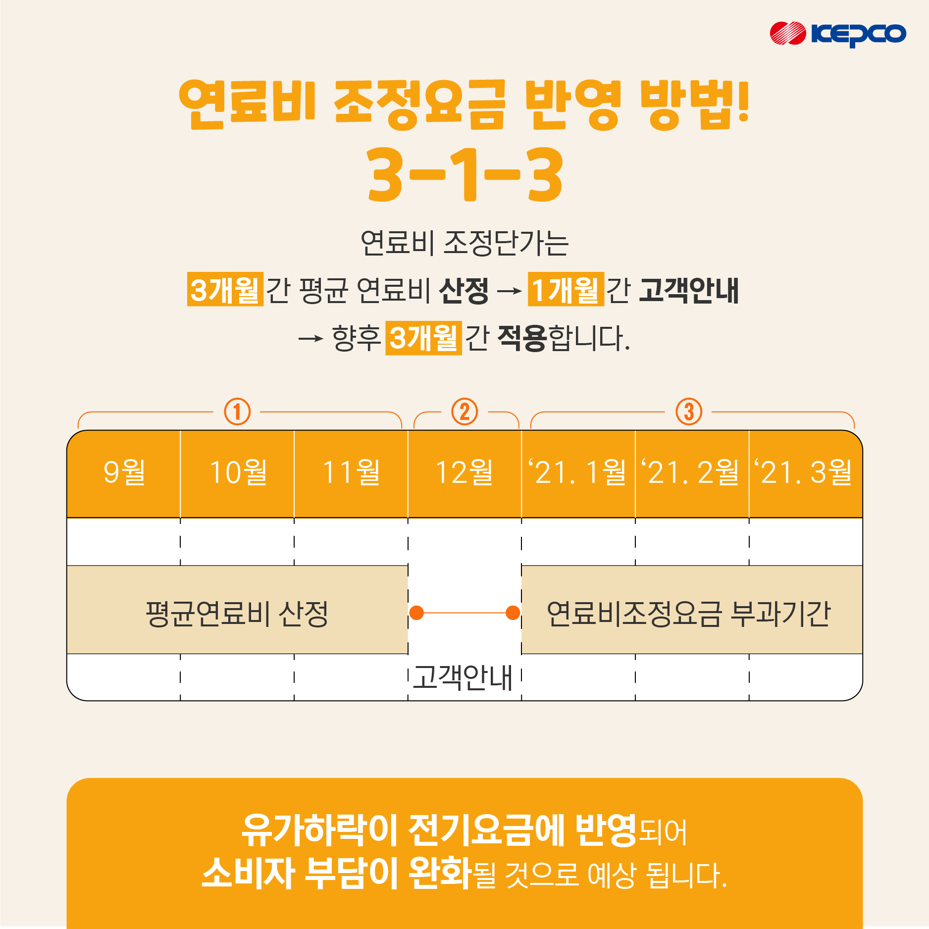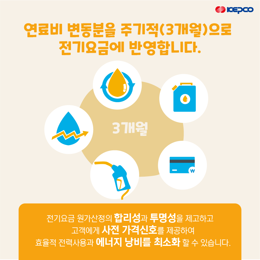 연료비 변동분을 주기적(3개월)으로 전기요금에 반영합니다.