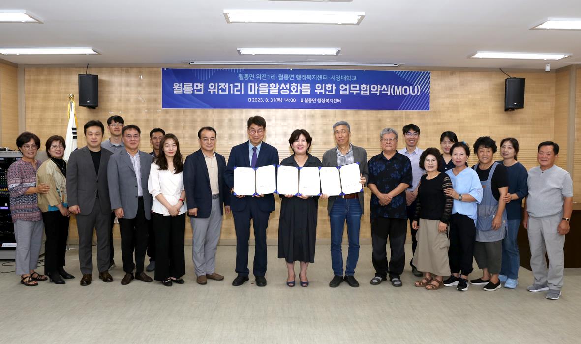 우리대학(총장 김정수)은 8월31일(목) 월롱면행정복지센터, 위전1리 마을회와 우호협력관계 형성 및 마을활력사업의 활성화를 위한 업무협약을 체결하였다. 월롱면 소회의실에서 진행된 협약식은 서영대학교 부총장 김순곤, 입학홍보처장 장철인 외 서영대학교 관계자와 위전1리 이장 사용환, 월롱면장 김은숙, 플레이그라운드 시소 대표 지민정 외 위전1리 마을주민들이 참석하였다.